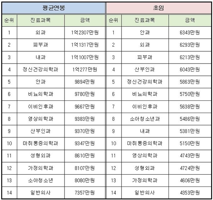 반면 전공의로 올라가면서 본격적인 고소득 의사들로 변신하게 됩니다. 한국고용정보원이 최근 발간한 ‘2018 한국 직업정보’ 보고서에 따르면 전공별 전문의들의 초임과 평균 연봉은 다음과 같이 조사되었습니다.
