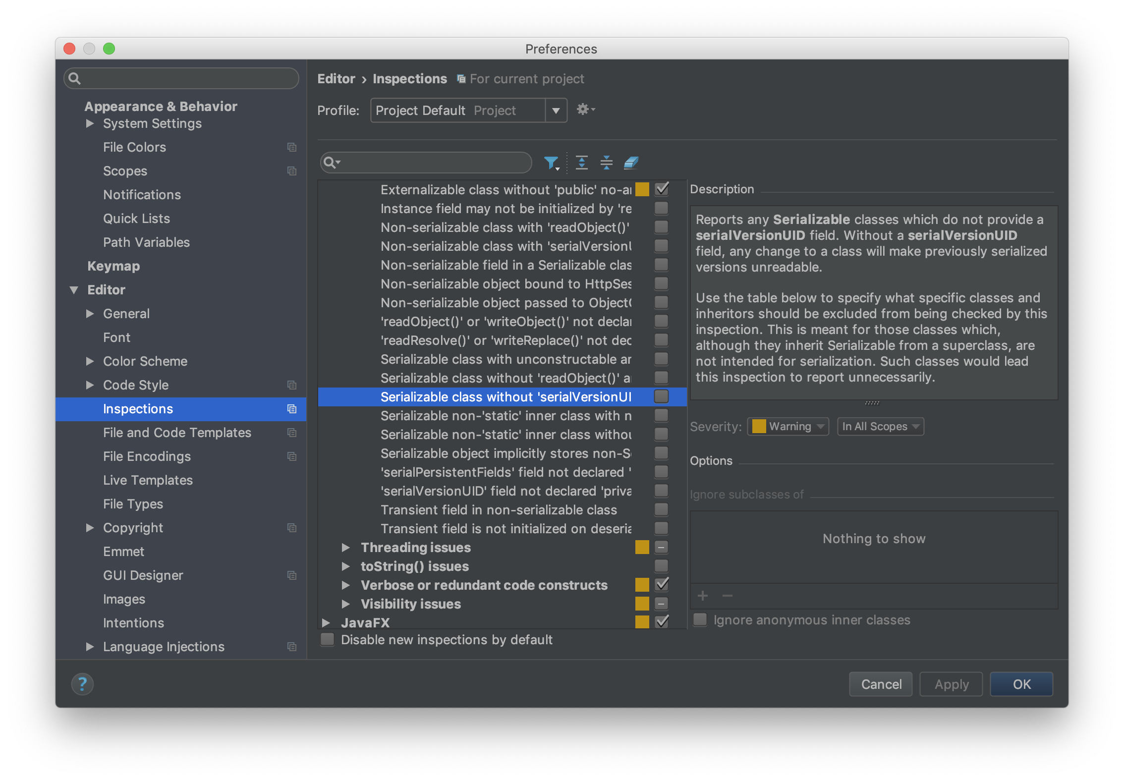 기본적으로 IntelliJ에서는 serialVersionUID를 정의하지 않았다고 해서 Warning을 띄우지 않는다. 하지만 위에서 말했듯이 다른 JVM, 다른 머신으로 직렬화하여 전송할 때 문제가 생길 수 있다. 따라서 명시적으로 개발환경에서 이런 Warning을 체크해주면 좋다.